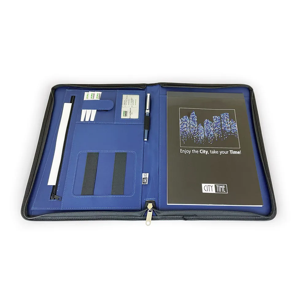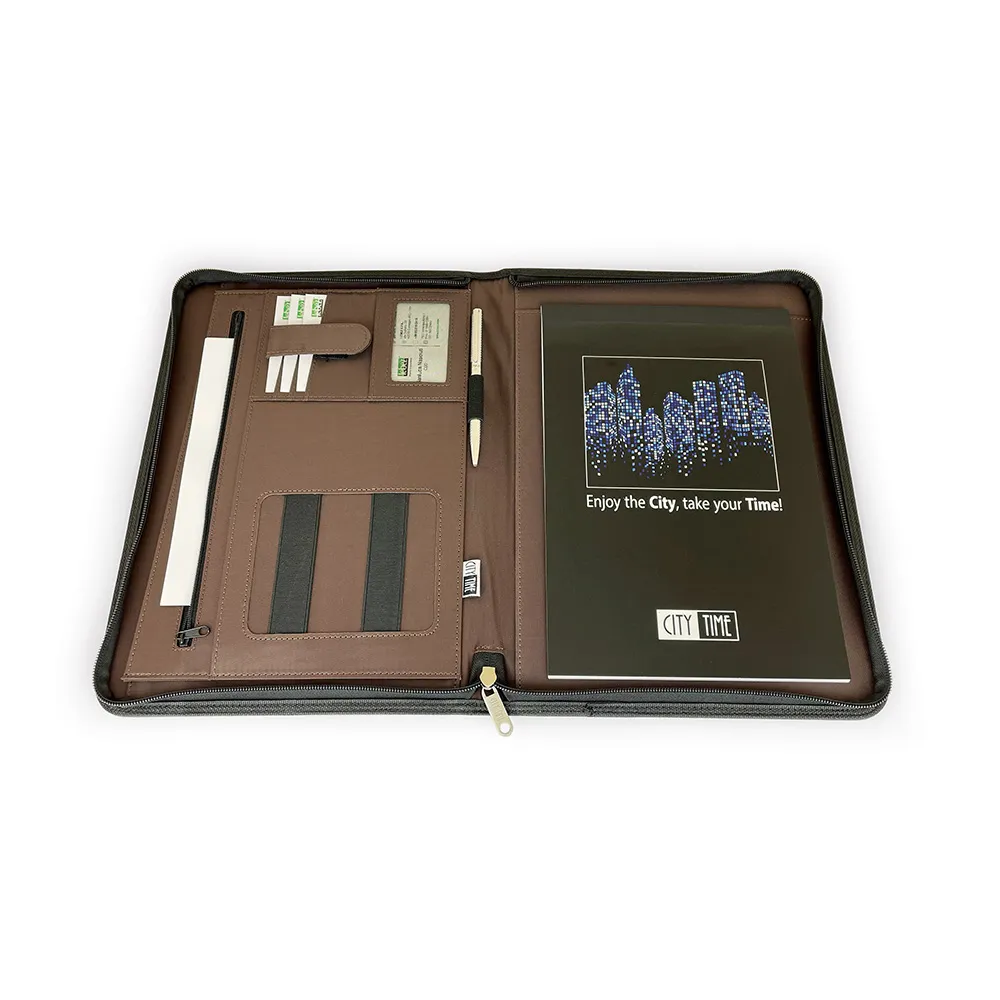 Portablocco linea PROFESSIONAL in eco-pelle, formato A4, chiusura con zip, scomparti per biglietti,