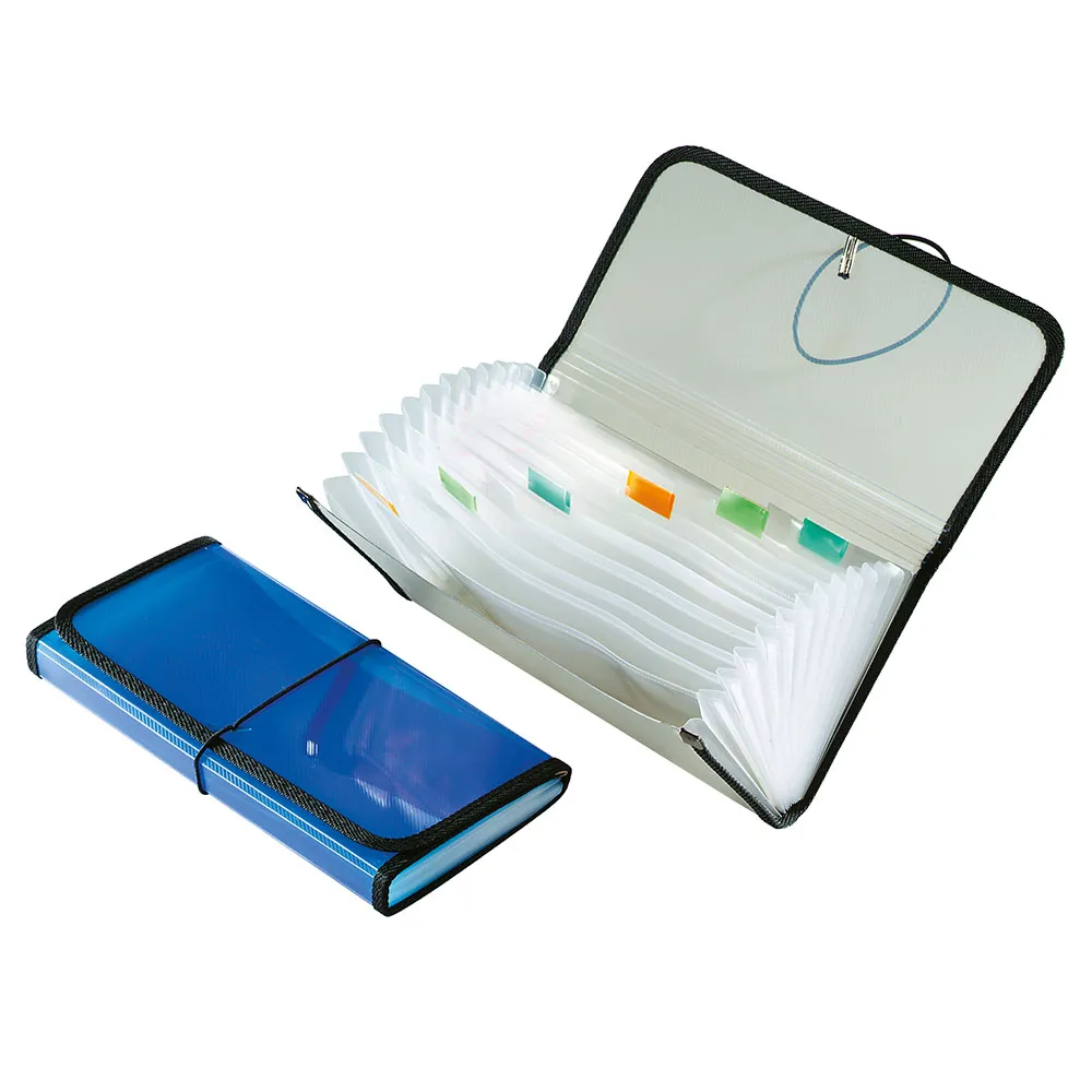 Classificatore portadocumenti in PP 26,5 x 13,5 cm, finitura rigata, 13 scomparti, targhette indicatrici colorate e bordatura.